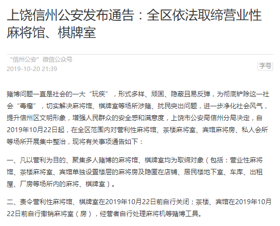 近日,江西上饶市信州、玉山警方先后发布“麻将馆禁令”,要求辖区内营业性麻将馆在10月22日前自行关闭,茶楼、宾馆附带的棋牌室在23日前自行撤销,在店铺、居民楼、出租屋等场所摆放麻将机,提供纸牌、麻将、骰子等工具用于赌博的自行停止。但没过不久,两地都删除了相关通告。