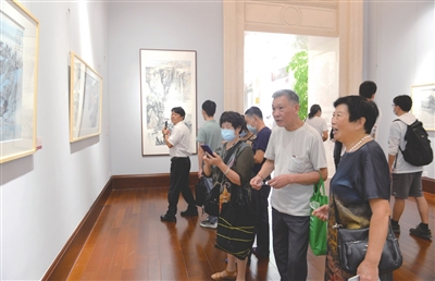 8月20日,“诗画浙江,‘艺’‘企’向党”张继钟山水画作品展在万丰莲花大厦艺术长廊开幕,绍兴文理学院新昌校友美术爱好者协会同时揭牌。据了解,本次画展由绍兴文理学院、县委宣传部主办,共展出绍兴文理学院艺术学院硕士生导师、绍兴市美术家协会副主席张继钟创作的越中山水画作品60余幅。 (记者 杨玉墀 摄)