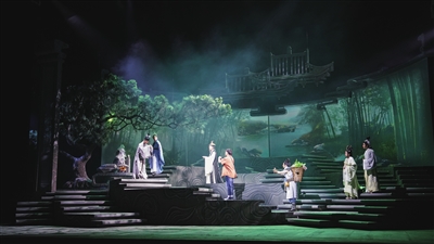 近日晚,由省委宣传部、省文化和旅游厅为指导单位的诗画音乐剧《诗路芳菲》首演在尹桂芳大剧院隆重上演,讲述了两位生于天姥山脚下、相隔千年的年轻人刘晨和阮肇因一条“古道”而相遇,携手展开一场关于山水、诗意、人生、疗愈的跨时空对话。该剧以高品质、年轻化、可巡演的戏剧舞台表现形式,在一幕一景一歌中带领观众穿越时空、穿梭古今,去感受诗词的独特魅力。 (记者 杨赟 摄)