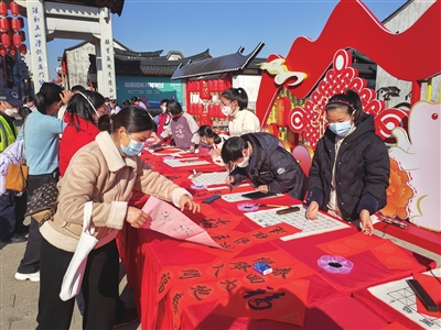 在里江北历史文化街区,气氛同样热闹。东镇牌坊入口处,已经布设了各式各样的春节造景小品。一串串红灯笼随风摇曳,山水云雾造型的展板中央,一只可爱的玉兔捧出一个大大的中国结,上面一个大红的“福”字格外醒目。展板前,十数张书案一字排开,在浓浓的墨香中,十几位小朋友正在认认真真地写春联。专业的架势、工整的字体,不时引来群众的夸赞。“我学习书法已经四五年了,看到自己写的春联被大家认可,觉得很开心。”一位“小书法家”高兴地告诉记者。
