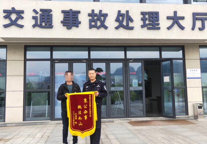5月5日,一起交通事故的双方当事人不约而同来到新昌县公安局交通警察大队,给民警潘伟钢送来锦旗,这是怎么回事?