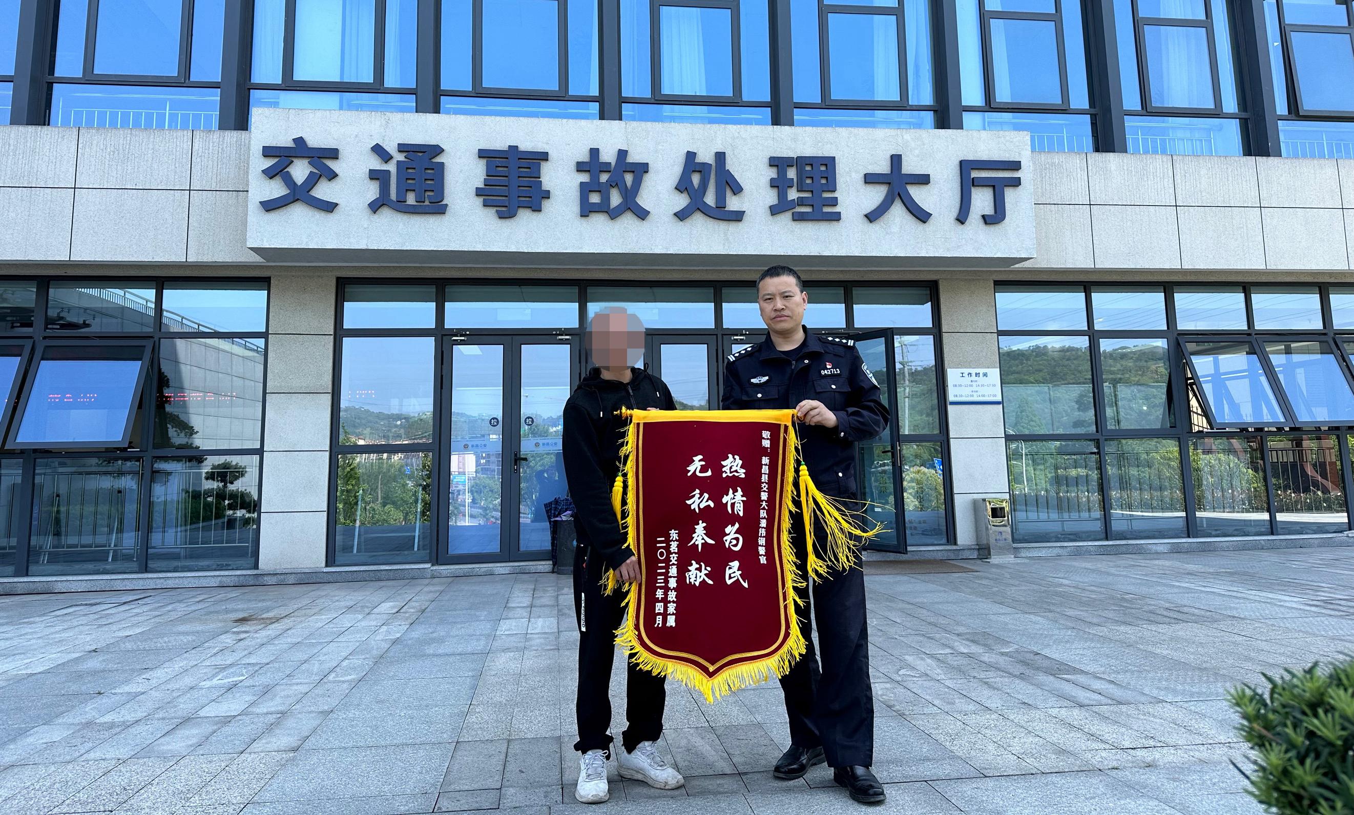 5月5日,一起交通事故的双方当事人不约而同来到浙江省新昌县公安局交通警察大队,给民警潘伟钢送来锦旗,这是怎么回事?