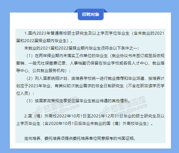 上述人员中属2023年国内应届毕业生须于2023年7月31前取得招聘岗位所需的学历、学位证书;往届毕业生须于报名前取得招聘岗位所需的学历、学位证书;国(境)外高校毕业生须于报名前取得教育部中国留学服务中心出具的境外学历、学位认证书。