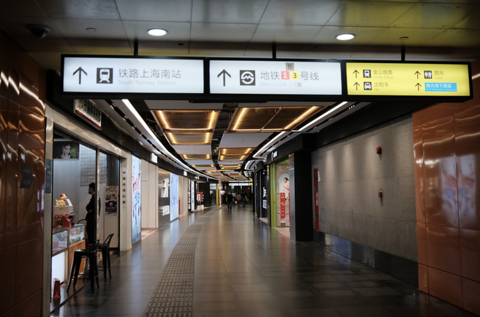 通往上海南站和地铁1、3号线的地方,两侧崭新的商家店面,灯火通明