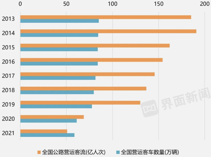 2019年只剩下130亿人次,尤其是疫情后,公路营运客流更是直接腰斩,2021年全年只有50亿人次