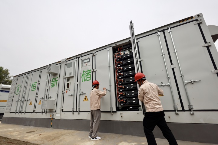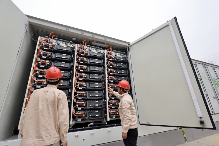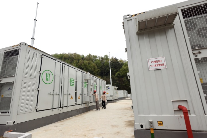 3月27日,工作人员在新昌高新园区储能电站检查电池运行状况。近日,浙江省规模最大的新型储能项目——新昌高新园区储能电站并网成功。 新昌高新园区储能项目是浙江省首批“十四五”新型储能示范项目,采用了国内最先进的集成和温控技术,电池采用的是市面上主流的磷酸铁锂电池,可实现年放电量6000万千瓦时以上,相当于减少二氧化碳排放约5万吨。