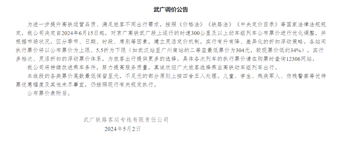 据中国经营报报道,12306网站客服称,从2024年6月15日起,武广高铁将进行提价。就票价折扣政策,客服说,折扣浮动策略将根据季节、客流强度等因素,由武广高铁决定,具体折扣标准旅客可以在12306网站购票时,通过页面显示获悉,武广高铁不会提前公布折扣标准、折扣时间等信息。12306网站客服强调,如12306网站购票页面不显示折扣,那么武广高铁从6月15日开始,全程票价就是553元。