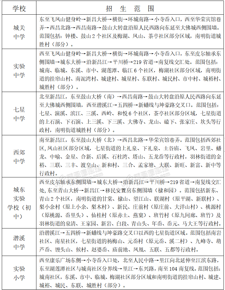 5.原建城区范围内撤村建居的行政村、南明街道的城胜村、七星街道的上石演、大佛寺村,可以参照第一类“行政村户籍”或第二类“有户有房”到相应的学校报名。城胜村户籍的新生如需以户籍为依据入学,须按户籍登记的具体地址到相应的学校报名。