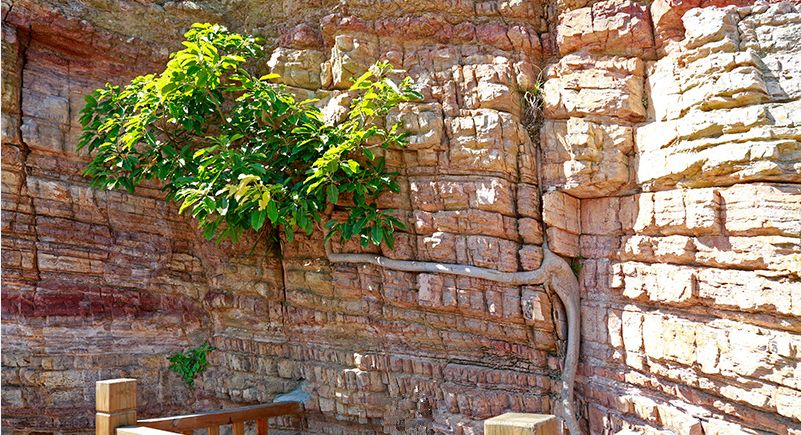 道坦岩地质点怪石林立,拥有大面积的页岩、火山岩、海蚀地貌、摩崖等,形成美人床、白龙戏水、红岩龟等自然景观,是市民观赏、游览的绝佳目的地。它是几千年前火山喷发留下的印记,岩石纹理清晰,岩色由深到浅渐变。岩壁上一棵不知名的树嵌入岩缝间顽强地生存,呈“7”字型成长,树冠如伞,枝干细长,树叶浓密,可以说得上是“树坚强”了。妩人岙沙滩