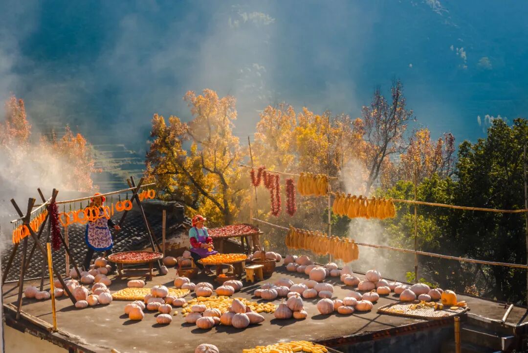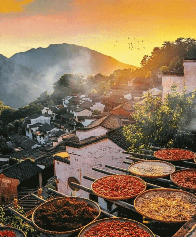 古村里,勤劳的晒秋大妈日出而作,将成熟的农作物分切晾晒,造就了晒秋最美的模样,亲切的乡音将思绪带回故乡,唤起游子心底的乡愁。