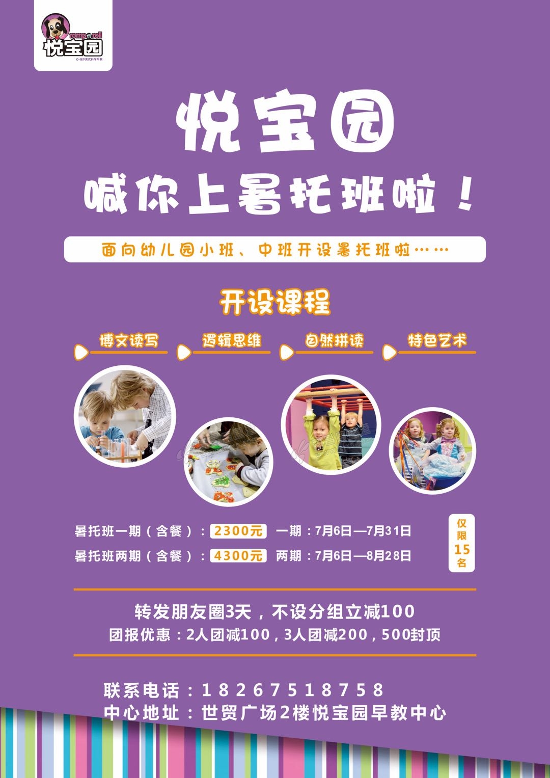 悦宝园喊你来上暑托班啦~ 丰富的日程安排 带孩子们度过安全、快乐的暑假 爸妈再也不用为孩子的暑假生活操心啦~ 中心地址:新昌世贸广场悦宝园早教中心(二楼童装区里面)