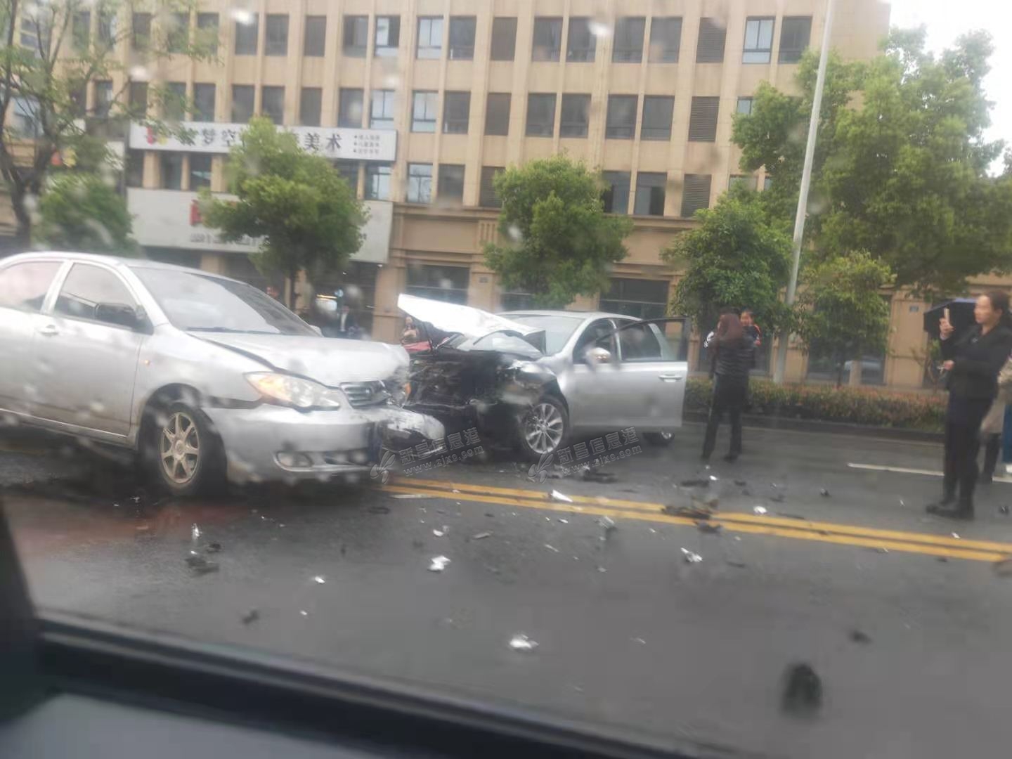 | 在现场,左边这车莫名其妙的开的超快越过双黄线撞上的,右边这车还停下来按喇叭了 |