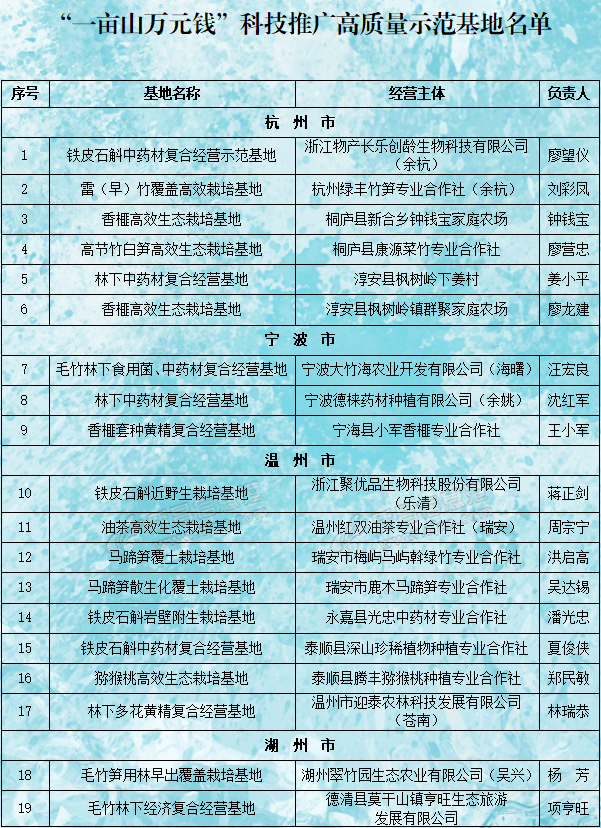 近日,省林业局公布了首批“一亩山万元钱”科技推广高质量示范基地名单,共有浙江物产长乐创龄生物科技有限公司的铁皮石斛中药材复合经营示范等64个基地通过认定,涉及经营模式主要有林下经济、木本粮油、竹(笋)林 ...