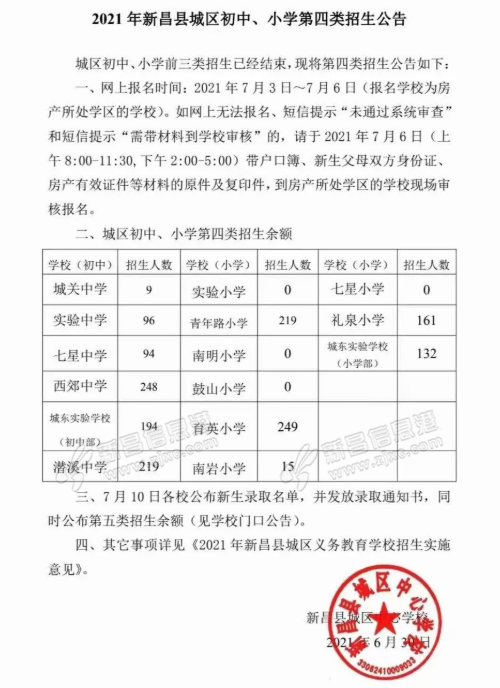 2021年新昌县城区初中、小学第四类招生公告,有需求的家长们需注意时间。 (转载至新昌发布公众号,原标题:2021年新昌县城区初中、小学第四类招生公告)