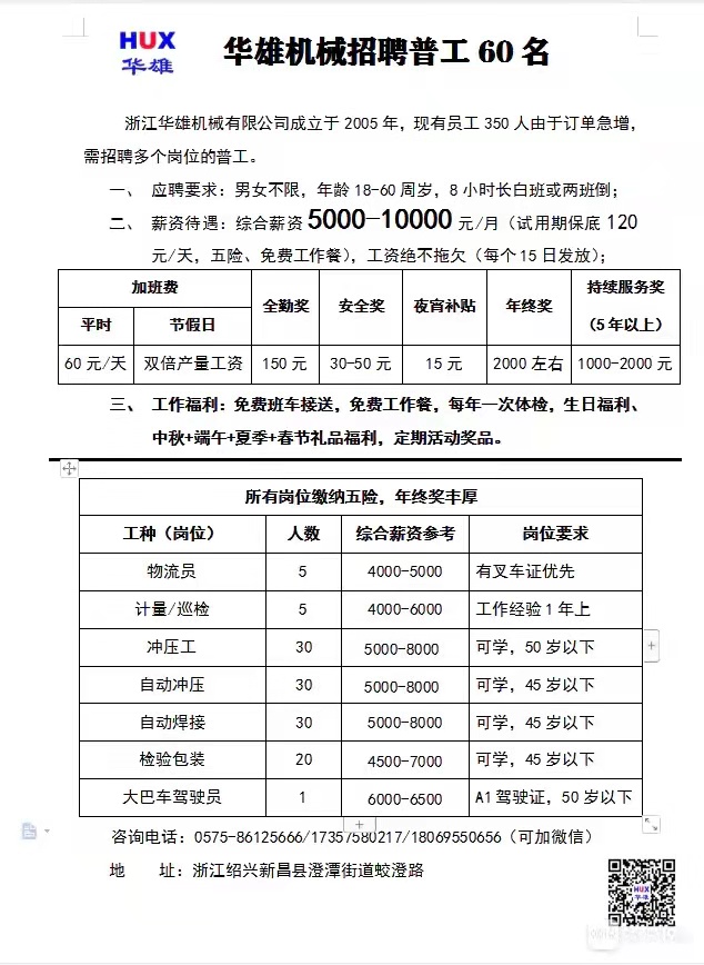 浙江华雄机械有限公司 诚招:冲压工,自动冲,自动焊接,检包员,巡检员,物流员等,欢迎大家推荐,公司设免费工作餐、班车接送,生日有蛋糕卡,加班有加班补贴、全勤奖等,联系人:俞女士 联系电话:135 ...