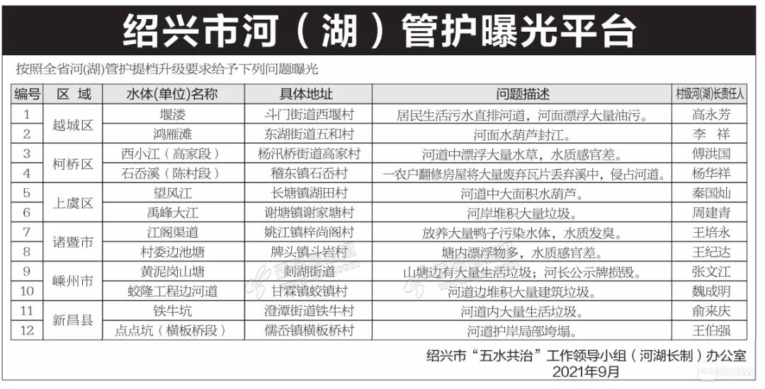 《绍兴日报》刊登绍兴市河(湖)管护曝光平台 全市12个水体(单位)因存在一系列问题 负责的12名责任人被曝光 其中,新昌有2名责任人的名字出现在曝光台上 ↓↓↓ 来源:绍兴日报