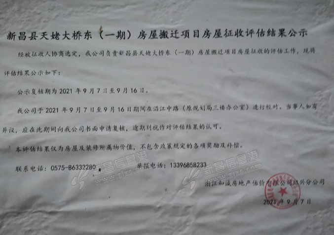 新昌县天姥大桥东(一期)房屋搬迁项目房屋征收评估结果公示经被征收人协商选定,我公司负责新昌县天诸大桥东(一期)房屋椒迁项目房屋征收的评估工作,现评估结果公示如下: 公示复核期为2021年9月7日至9月16 ...