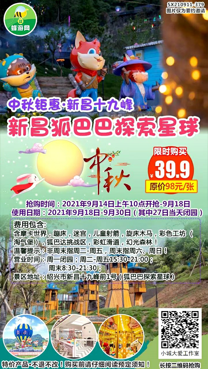 新昌狐巴巴乐园门票中秋钜惠来袭,今天早上10:00准时开抢,锁定蜂游网,自驾出现不迷路[庆祝]【中秋献礼·新昌狐巴巴】原价平日68元/位&周末98元/位的乐园门票!抢购价39.9元。网红小火车原价80元抢购价39.9元,的 ...