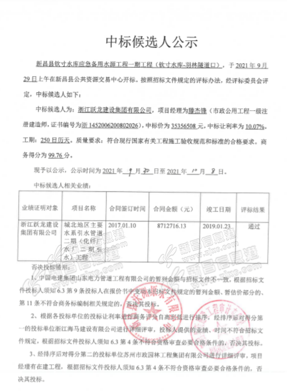 网友:新昌羽林方向以后先能用上钦寸水库的水了,一期工程先铺设到羽林隧道。 中标候选人公示 新昌县钦寸水库应急备用水源工程一期工程(钦寸水库-羽林隧道口),于2021年9月29日上午在新昌县公共资源交 ...