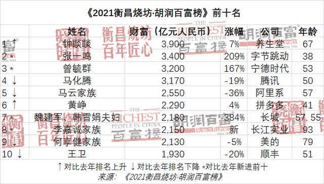 胡润百富网站10月27日消息,胡润研究院今日发布《2021胡润百富榜》。榜单显示,农夫山泉67岁的钟睒睒财富比去年增长250亿,即7%,以3900亿元首次成为中国首富。抖音创始人38岁的张一鸣财富增长至去年的3倍,增长了23 ...