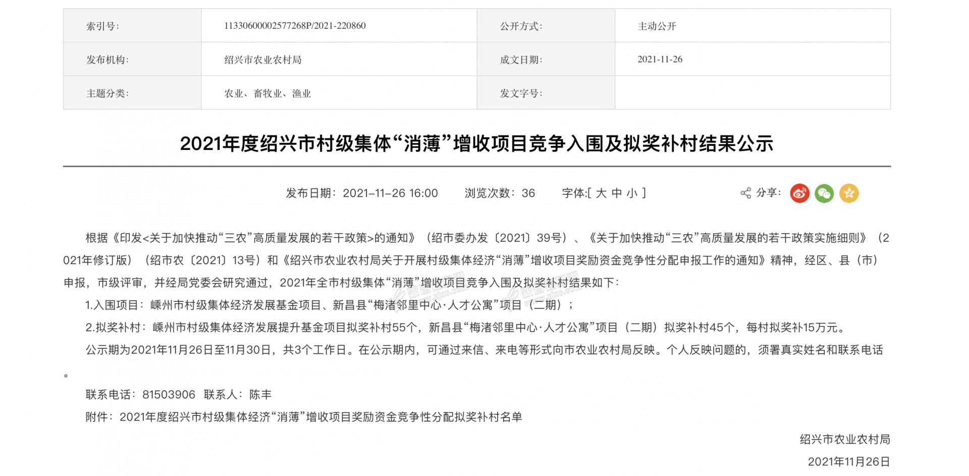 近日,绍兴市人民政府网上发布《2021年度绍兴市村级集体“消薄”增收项目竞争入围及拟奖补村结果公示》,小布发现绍兴有100个村拟奖补15万元。 来源:绍兴发布、绍兴市人民政府网