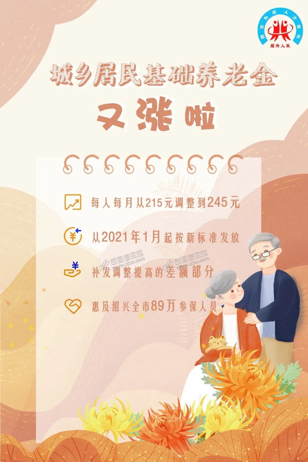日前,绍兴市人力资源和社会保障局发布了关于调整城乡居民基本养老保险基础养老金标准的通知。文中指出从2021年1月1日起,绍兴全市城乡居民基本养老保险基础养老金标准由每人每月215元调整为245元。 来源: ...