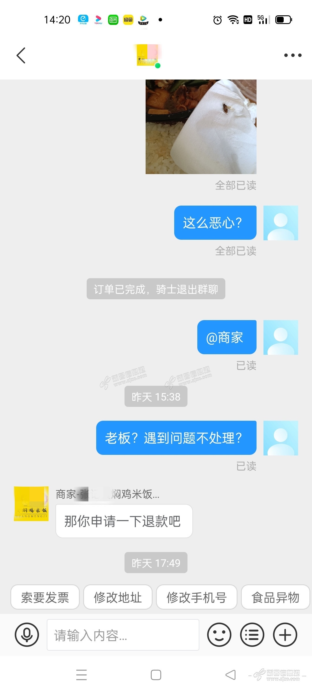 一只傻缺猫 发表于 2021-12-08 11:23 我在线投诉,但是饿了么平台还是继续让店家在线上营业,不知道下一个会是谁点了他家的东西,吃出蟑螂! |