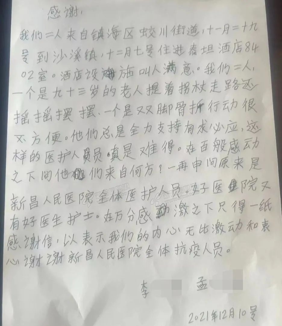一封小小的感谢信道不完的是心里的感谢 感谢信 12月10日,新昌县集中医学观察点的医护人员收到一封“特殊”的感谢信:“他们总是全力支持、有求必应,这样的医护人员真是难得……在万分感激之下写了一封感谢信,谢 ...