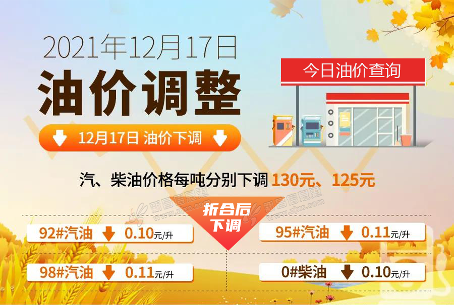 12月18日0时起,国内成品油零售价“第24轮”调整,汽油每吨下调130元,柴油每吨下调125元,折算为平均下调0.10-0.11元/升,油价“3连跌”,也是今年“第6次"下调,明天起加满一箱油(50升)可节省5-5.5元左右。 ...