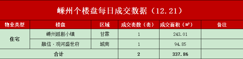 根据新昌楼市交易系统数据统计 12月22日新昌楼市新房成交量数据报告 2021年12月21日嵊州住宅签约2套,签约面积337.86㎡; 二手房签约5套,签约面积559.85㎡。 数据来源:新昌县房产管理系统、嵊州 ...