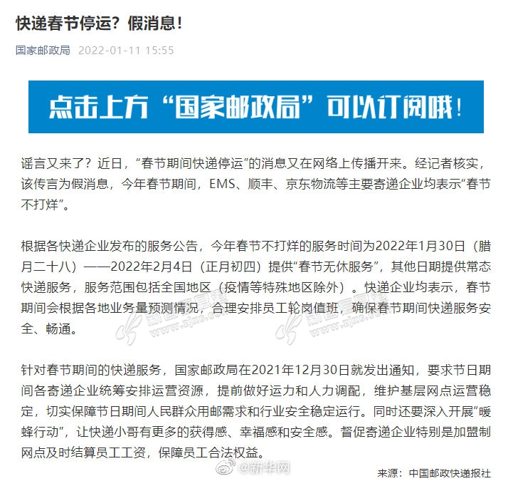 近日,“春节期间快递停运”的消息又在网络上传播开来。经记者核实,该传言为假消息,今年春节期间,EMS、顺丰、京东物流等主要寄递企业均表示“春节不打烊”。 根据各快递企业发布的服务公告,今年春节不打烊的服 ...