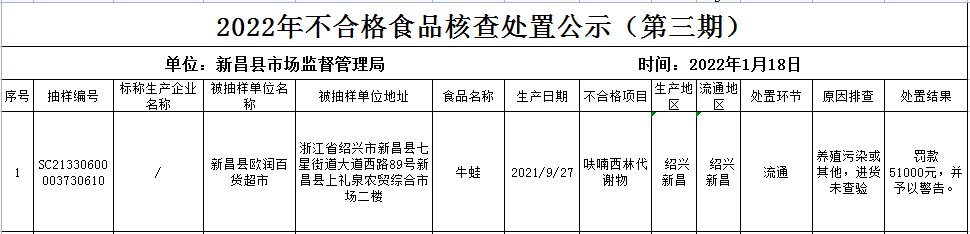 2022年新昌县市场监督管理局 抽检不合格食品核查处置公示(第三期) (点击查看大图) 据了解,2022年新昌县市场监督管理局抽检不合格食品风险控制情况的通告(第二期)中通告了新昌县欧润百货超市经营 ...