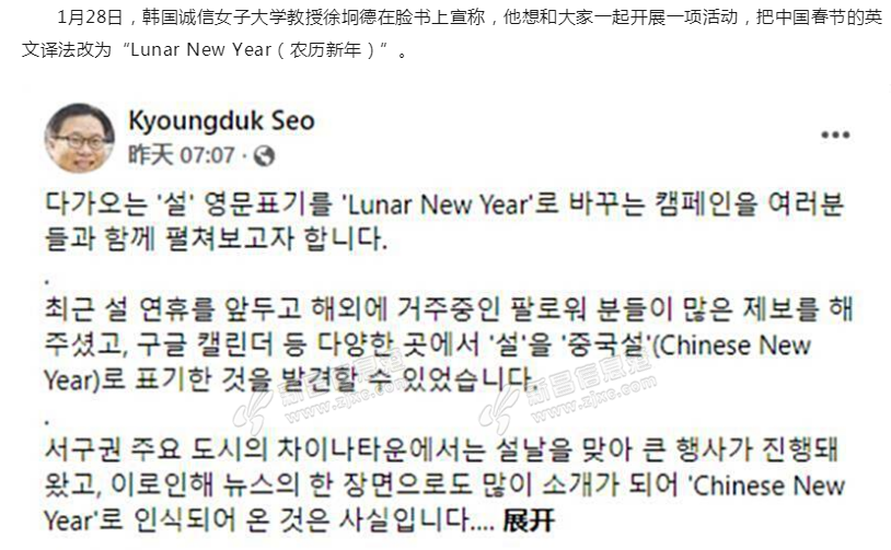 这并不是韩国第一次想改春节的译名了。从2012年起,在谷歌搜索“Lunar New Year”时自动显示“Chinese New Year”,搜索结果页面顶部和右侧信息框中会提供有关中国春节的信息。2019年2月,韩国网络外交使节团 ...