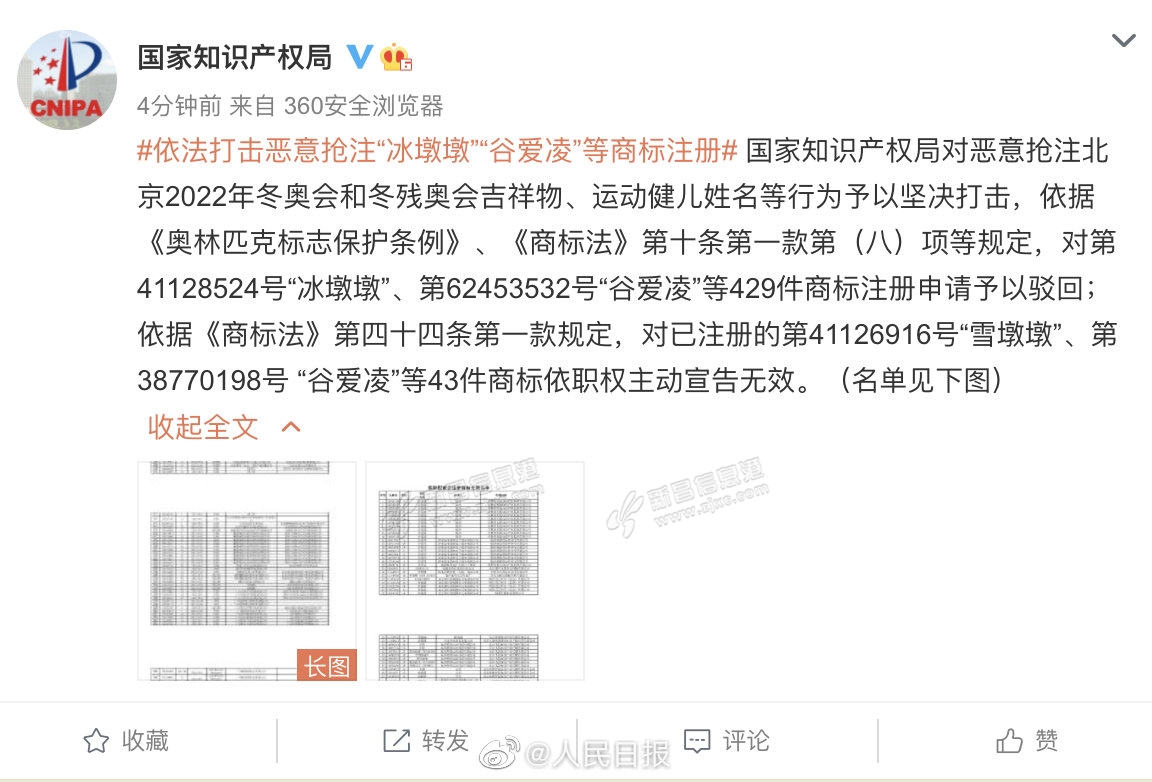 @国家知识产权局 14日发布通告,依法打击恶意抢注“冰墩墩”“谷爱凌”等商标注册。依据《奥林匹克标志保护条例》、《商标法》第十条第一款第(八)项等规定,对第41128524号“冰墩墩”、第62453532号“谷爱凌”等42 ...