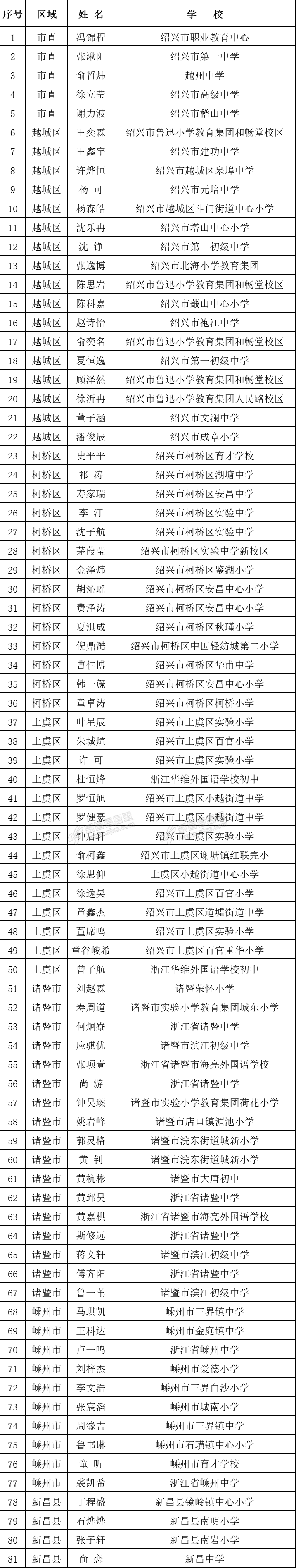 根据《绍兴市教育局办公室关于开展全市第七届“智能少年”评选活动的通知》,经推选、评审、复核,拟确定冯锦程等81名同学为绍兴市第七届“智能少年”,现将名单予以公示。 绍兴市第七届“智能少年”拟入选名单 ...