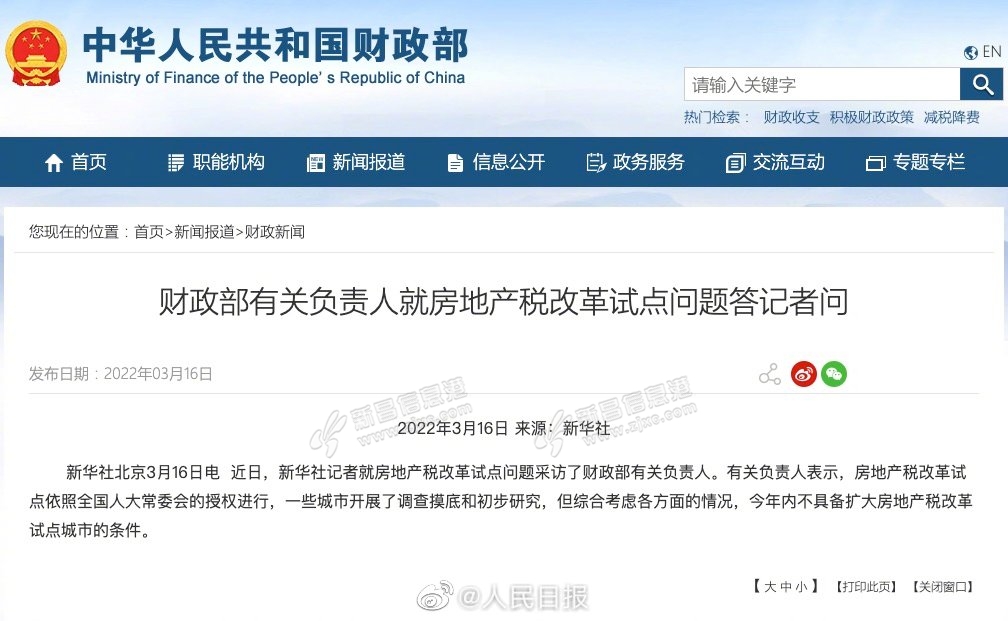 财政部有关负责人表示,房地产税改革试点依照全国人大常委会的授权进行,一些城市开展了调查摸底和初步研究,但综合考虑各方面的情况,今年内不具备扩大房地产税改革试点城市的条件。网页链接 ...
