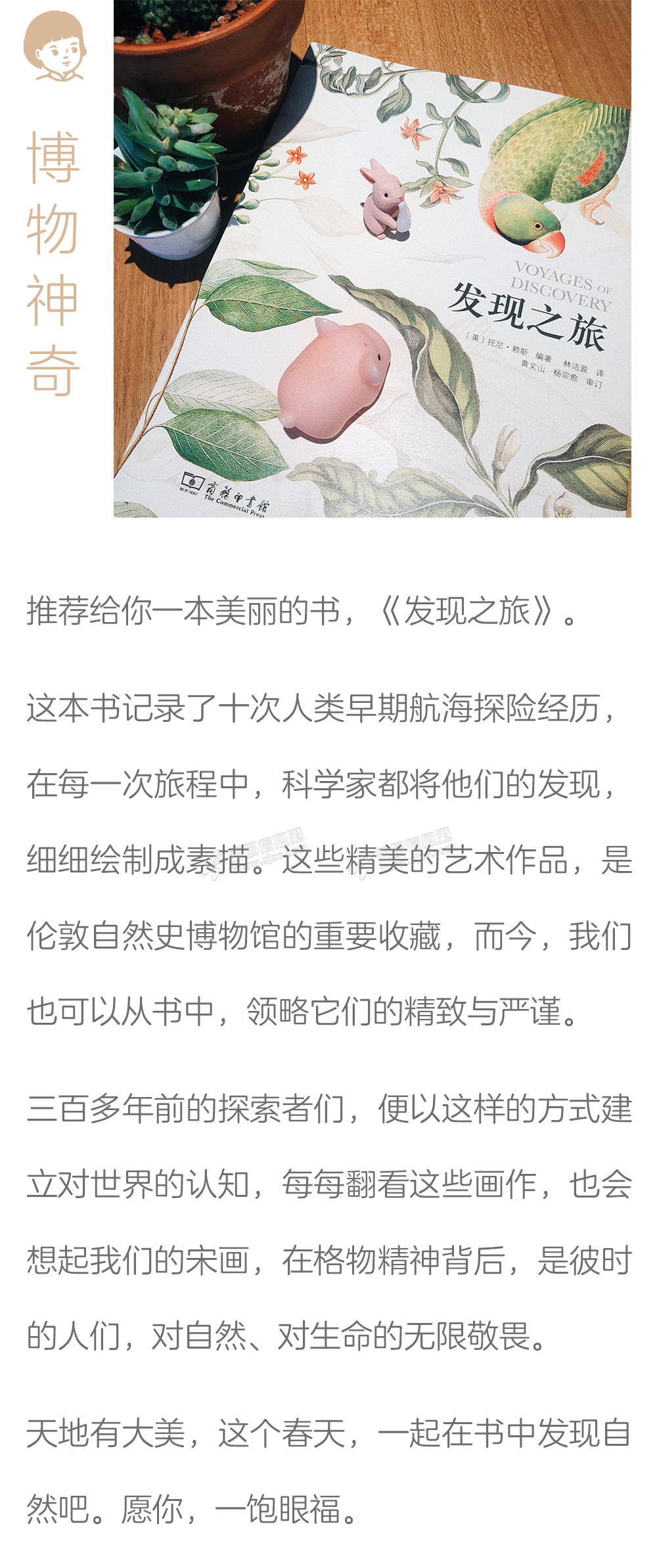 这是春天慢慢生发的时节,留意周遭,绿芽悄悄冒出尖尖,也有花朵渐次开放,我们只需静静等待,也各自尽力,好好生长。 推荐一本书 · 《发现之旅》 还有,一个今天,今天就是一个礼物~祝你快乐~