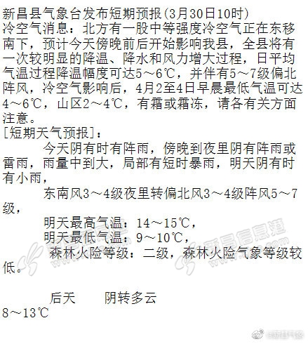新昌县气象台发布短期预报(3月30日10时) 冷空气消息:北方有一股中等强度冷空气正在东移南下,预计今天傍晚前后开始影响我县,全县将有一次较明显的降温、降水和风力增大过程,日平均气温过程降温幅度可达5~6℃, ...