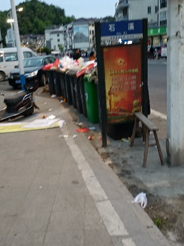 新昌县城南乡石溪公交车站台 垃圾乱飞 垃圾房作用在那里