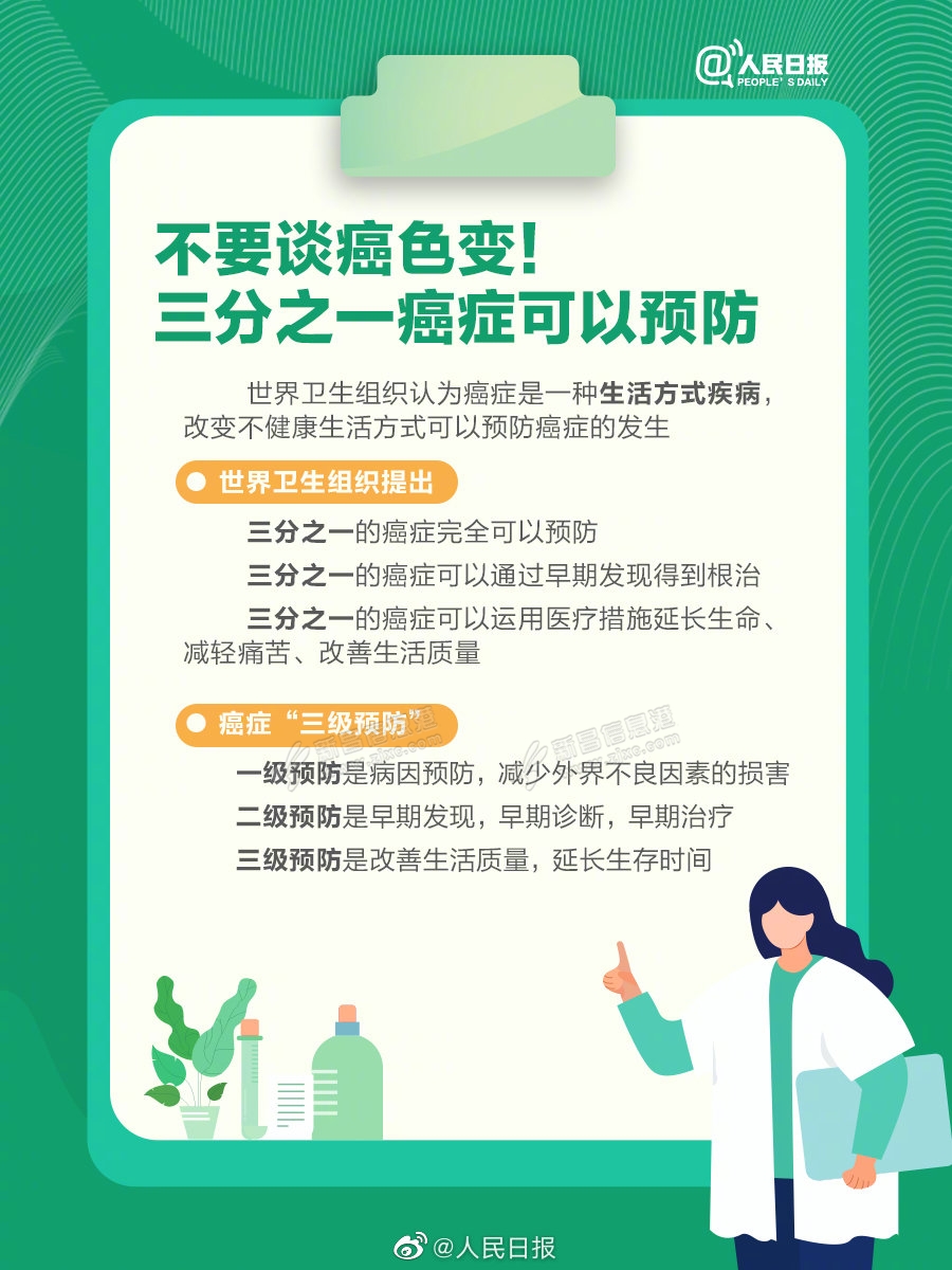 世界卫生组织认为癌症是一种生活方式疾病,三分之一的癌症完全可以预防。最常见的23种致癌因素有什么?肿瘤早期5个报警信号有哪些?全国肿瘤防治宣传周,转存10大高发癌症筛查及预防指南↓↓科学防治,别再谈癌色变 ...