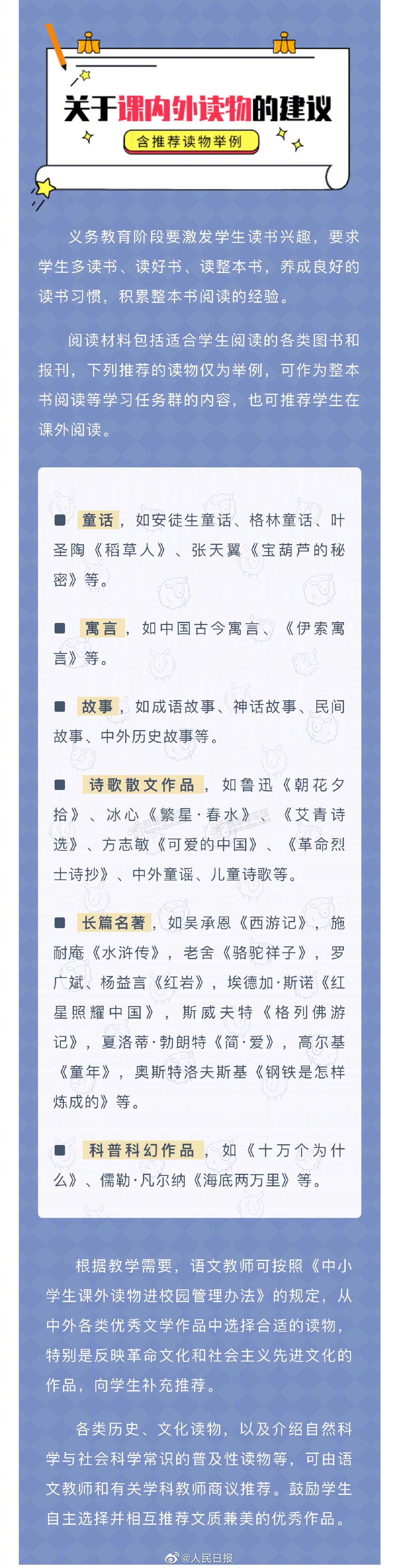 近日,义务教育语文课程标准(2022年版)正式发布,其中列出义务教育阶段优秀诗文背诵推荐篇目名单以及义务教育课内外推荐读物的建议内容。戳图↓↓转给学生和家长!(首都教育) ...