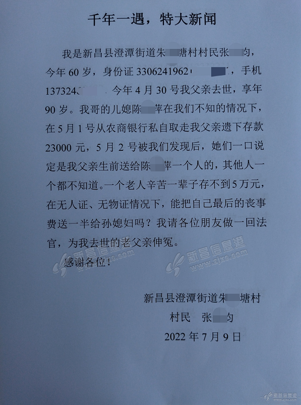 | 至于侄媳妇说是送的,还是其他什么途径得到的存单,我们也不得而知。但是家门口监控显示,前一晚侄媳妇进过家里逗留,第二天老人就脑溢血走了。 |