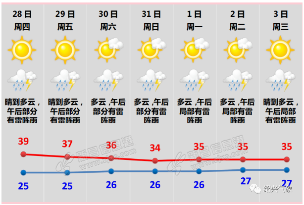 昨天晚上,一场暴雨,让绍兴的气温降了不少,不过今天一早,高温就卷土重来了。 绍兴市气象台今天6:00发布的天气预报: 今天到明天晴到多云,每天午后局部有雷阵雨,以上有雷雨地区局地可伴有短时暴雨和8~10级 ...