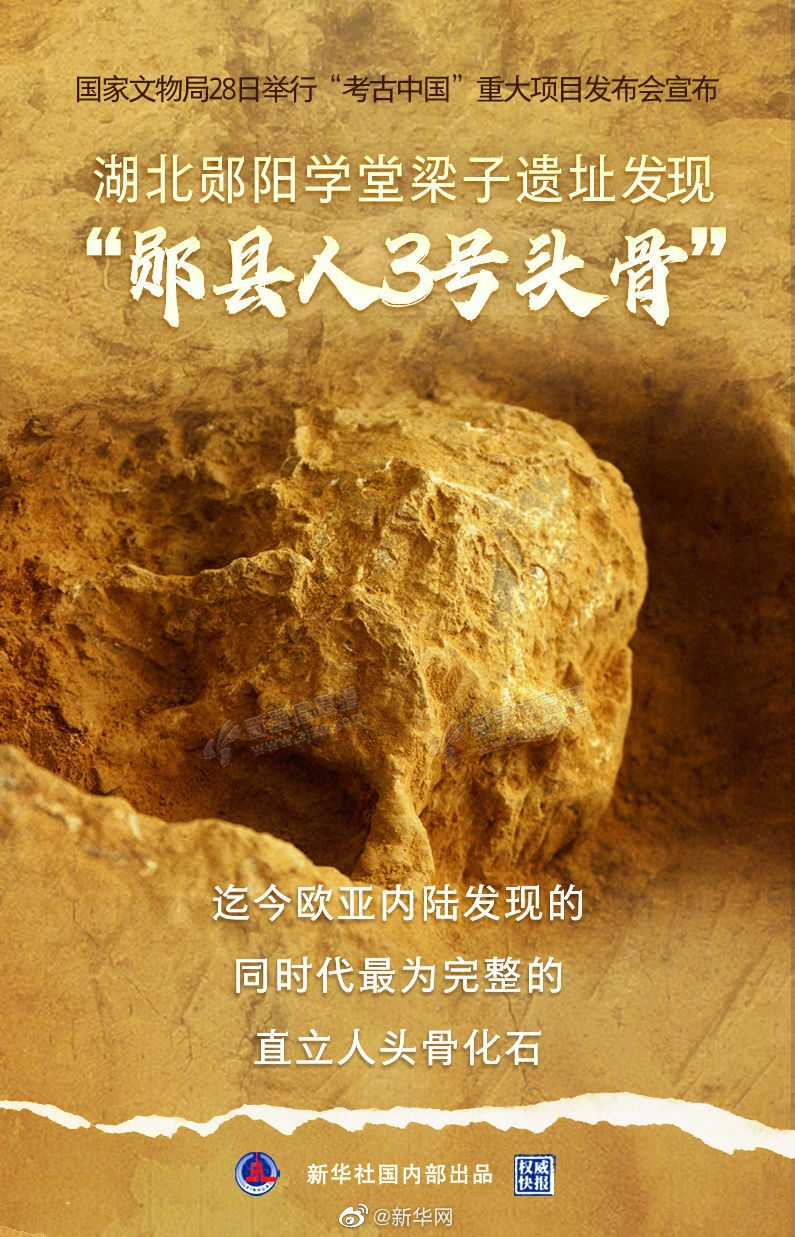 记者从国家文物局9月28日举行的“考古中国”重大项目发布会上获悉,湖北郧阳学堂梁子遗址考古工作取得重要进展,发现1具保存较为完好的古人类头骨化石,命名为“郧县人3号头骨”。这是迄今欧亚内陆发现的同时代最为 ...