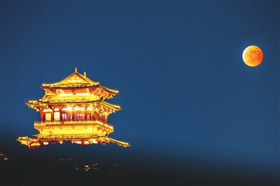 前两天月亮不是变色了吗,刚看到一张图,是天姥阁和月亮一起出镜的,感觉还不错。 记者 石磊 摄 就是天姥阁有点像是披上去的