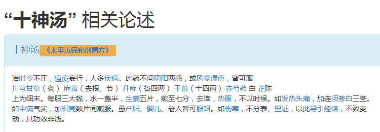 在群里看到有人发了个中药方子,说是民间老中医的传世秘方! 于是,我就偷偷的问了度娘,确实是个中医名芳,叫做“十神汤”。 十神汤,中医方剂名。出自《太平惠民和剂局方》。具有疏风散寒,理气和中的功效。主治 ...