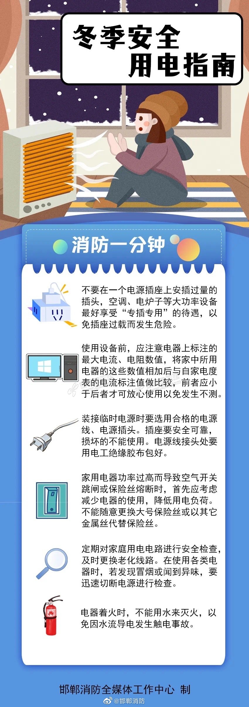 冬季天干物燥,随着气温的逐渐转凉,火灾危险系数逐渐增高,了解这些冬季用电安全知识,让我们一起做防患于未“燃~~ 来源:@邯郸消防