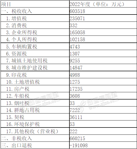2022年税收收入603518万元,非税收入660215万元。2021年税收收入668232万元,非税收入507888万元。受增值税留抵退税影响,2022年增值税税收收入235071万元,2021年增值税税收收入304584万元,下降69513万元。2022年 ...