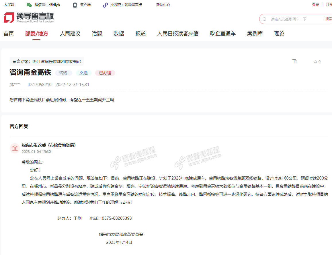 近日,针对甬金(宁波至金华)高铁规划建设问题,绍兴市发改委答复:“目前,金甬铁路正在建设,计划于2023年底建成通车。金甬铁路为客货兼顾双线铁路,设计时速160公里,预留时速200公里,在嵊州市、新昌县分别设有 ...