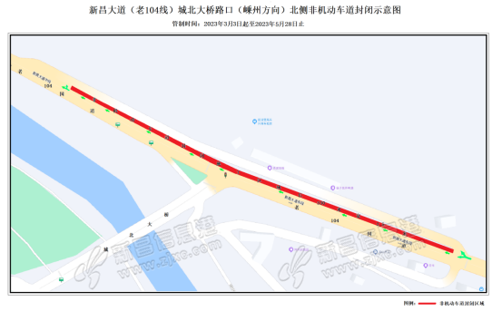 因新昌大道(老104国道)七星大桥至城东大桥段机非隔离带绿化提升工程施工需要,根据《中华人民共和国道路交通安全法》等相关法律、法规规定,决定对新昌大道(老104线)城北大桥路口段临时调整交通组织措施,现将有 ...